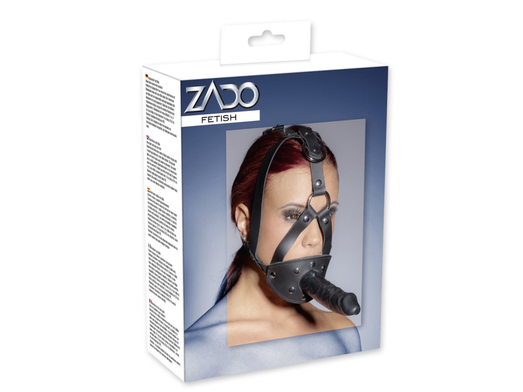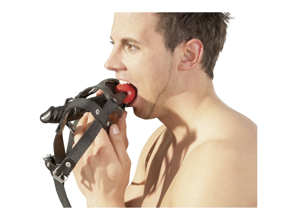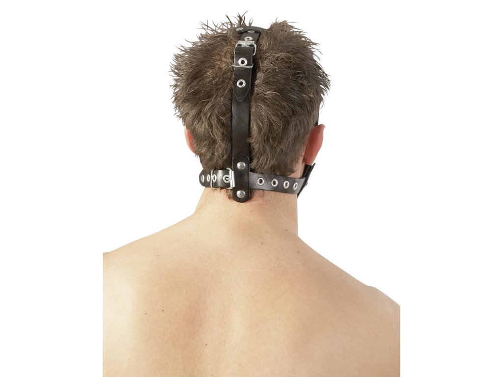 Postroj na hlavu z kožených řemenů s vnitřním roubíkem a vnějším masturbátorem.